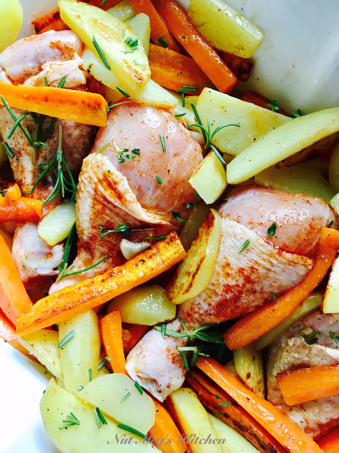 - Spread the roasted vegetables around the chicken, put the rosemary on top of the chicken and vegetables and put it in the oven for ca. 45 min (the chicken and vegetables should be golden brown when done).