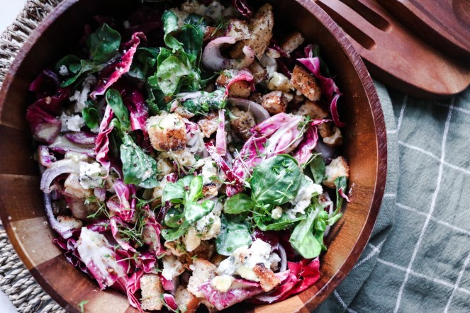 - Place the warm croutons on the salad, crumble big chunks of cheese into it, pour the dressing over the salad, toss it, sprinkle micr-ogreens or chives over it, and serve it.